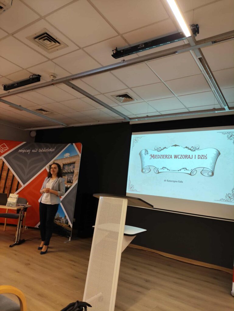 24 kwietnia 2026 r. w Wojewódzkiej Bibliotece Publicznej w Kielcach miałam możliwość zaprezentowania mojej książki: „Miedzierza wczoraj i dziś” na V Świętokrzyskich Dniach Książki Historycznej. W swoim wystąpieniu opowiedziałam o historii Miedzierzy oraz o tym, jak powstała książka. Starałam się przekonać słuchaczy, że to co działo się w tej stosunkowo niewielkiej miejscowości, doskonale wpisuje się w historię regionu, a nawet w historię Polski. Wyraziłam przekonanie, że ta „mała historia” pozwala pojąć tą „dużą”. Wskazałam na olbrzymi potencjał, jaki tkwi w historii regionalnej. Ułatwia ona bowiem zrozumienie różnych wydarzeń i procesów historycznych, a co więcej potrafi wzbudzić olbrzymie emocje, gdyż opowiada o tym, co jest nam bliskie i drogie.