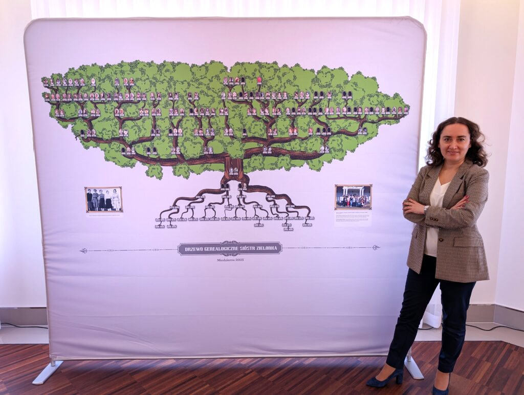 Na zdjęciu stoję przy opracowanym drzewie genealogicznym mojej rodziny. Drzewo to przedstawia przodków i potomków sióstr Zielonka, o których wielokrotnie wspominam na kartach książki. Liczy 12 pokoleń i 217 osób. Najdalej sięgającym w przeszłość korzeniem jest Szymon Tomala z Przyłóg, który urodził się około 1731 roku, najmłodszą zaś gałązką jest ośmiomiesięczna Zosia.